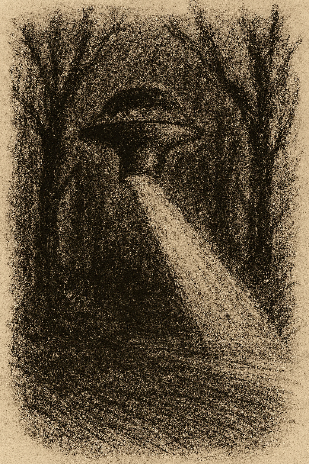 Betty saw it first. What looked like a star began to move—brightening, dimming, then plunging straight down between two trees. The car vibrated. Something metallic and mushroom-shaped hovered above the woods, casting a beam of light that crept along the ground in a straight, unwavering line. It wasn’t a searchlight. It was something else. Something that lit up the forest floor as if scanning it.